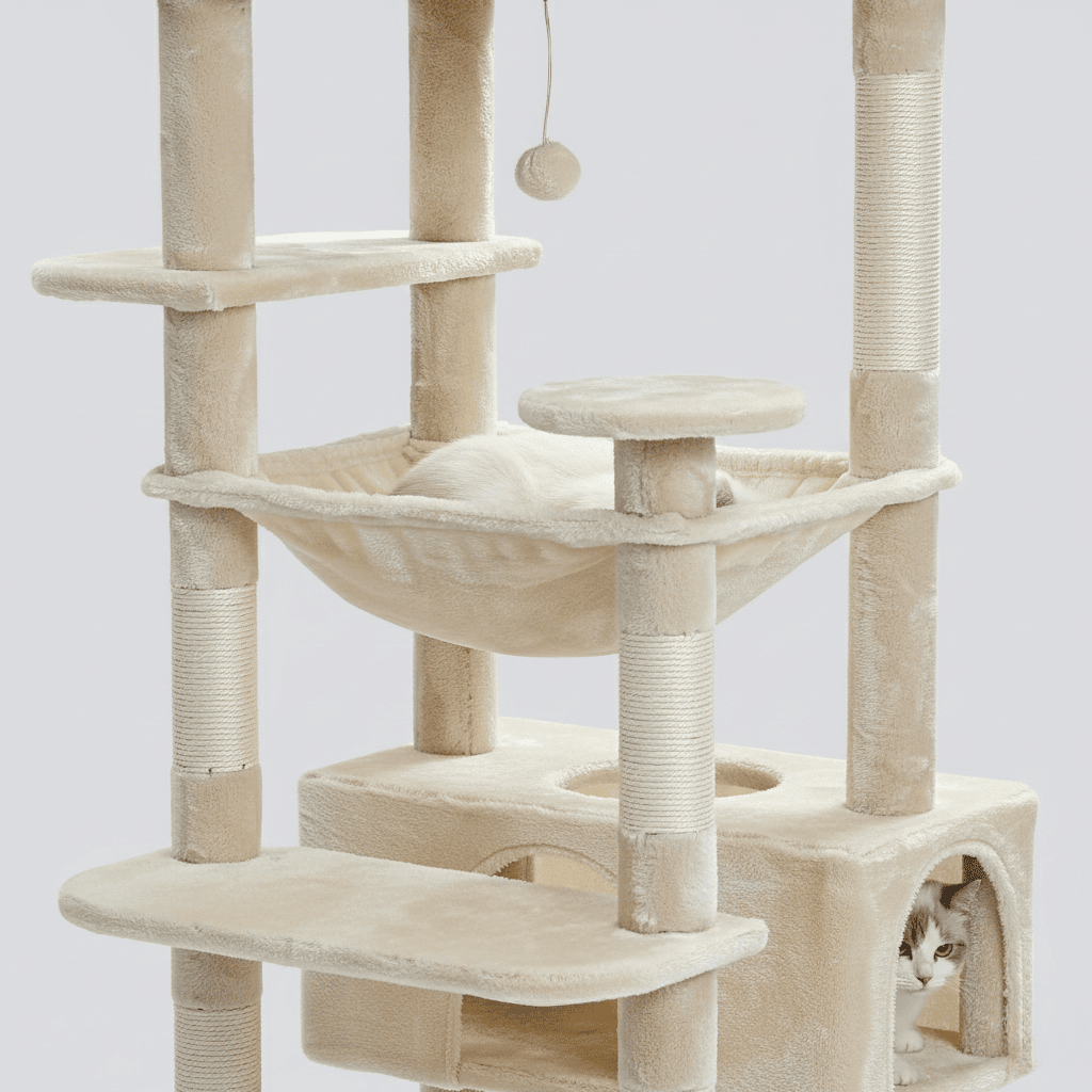 Grâce à son hamac large et ses espaces rembourrés, cet arbre à chat devient un véritable cocon de repos. Sa construction stable, combinée à une base large, élimine les risques de basculement, même pour plusieurs chats en même temps.