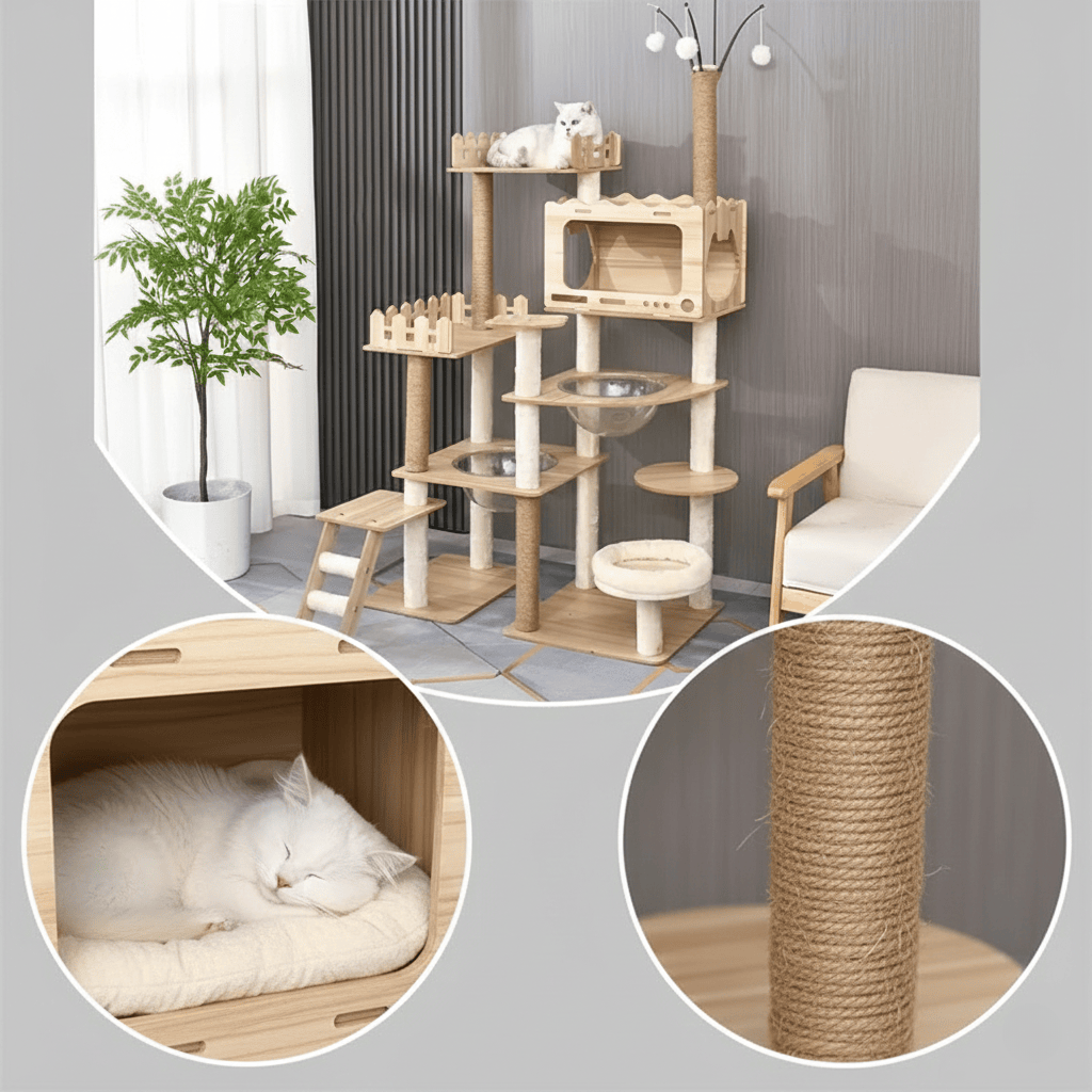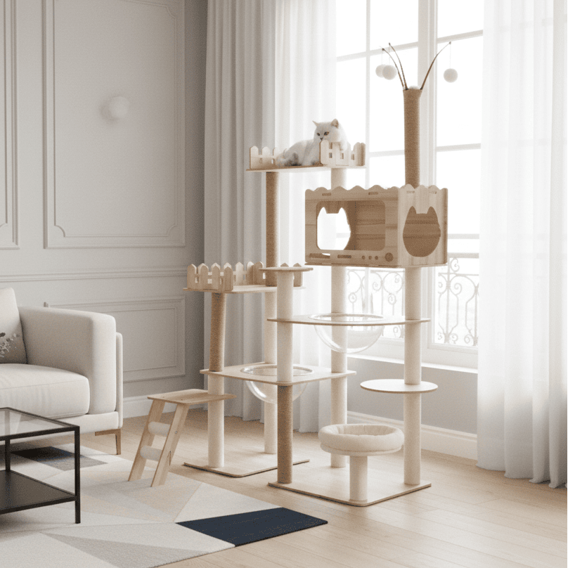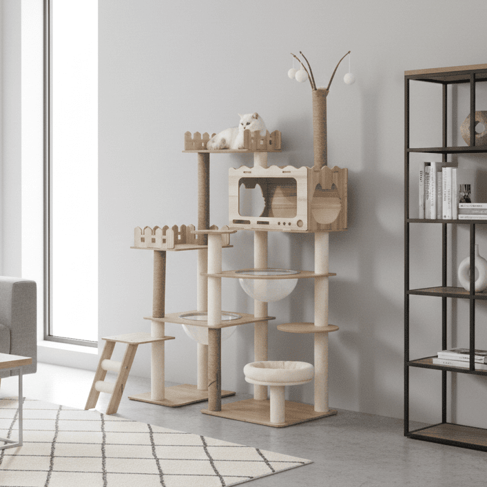 L'Arbre à Chat Yumi se distingue par sa grande taille, ses fonctionnalités multiples et son design élégant. Contrairement à de nombreux arbres à chat, il combine l'aspect pratique à une esthétique raffinée, faisant de lui un objet de décoration en plus d'un espace de détente pour votre chat. Sa construction robuste et ses matériaux de qualité en font un choix durable et résistant, adapté même aux foyers avec plusieurs chats.